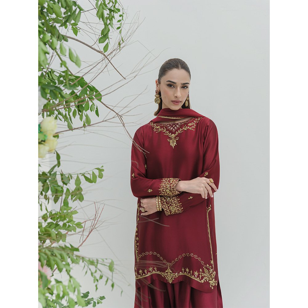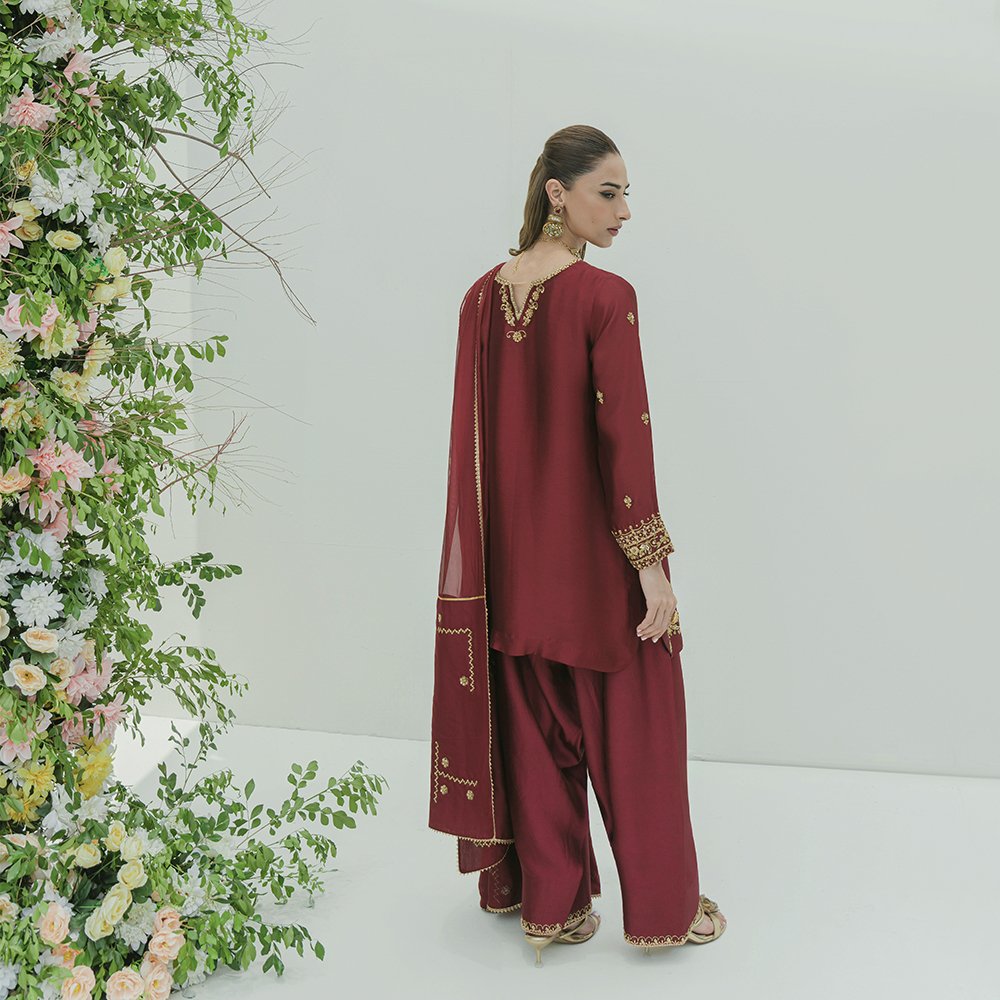 Introducing classic Berry Maroon Shisha Silk Shirt with cutwork motif , elaborate handwork neckline and heavily hand worked sleeves with subtly shimmering gold dabka and gota , zari , beads and swarovskis embellished.