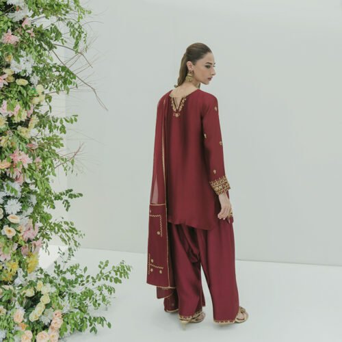 Back Neckline is further adorned with handwork. Pair it with a striking handwork dupatta . Complete your outfit with our signature hand-work Farshi Shalwar.